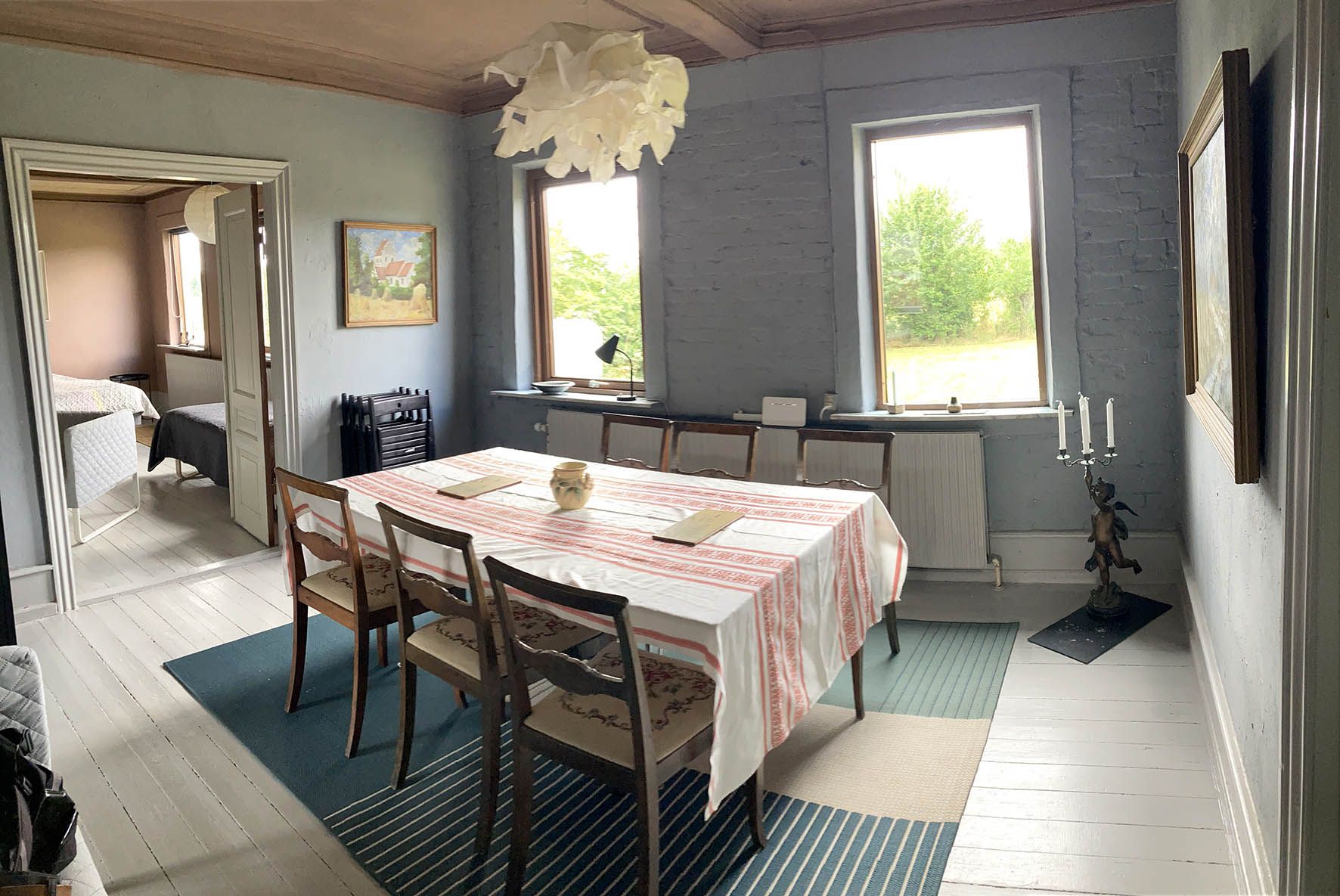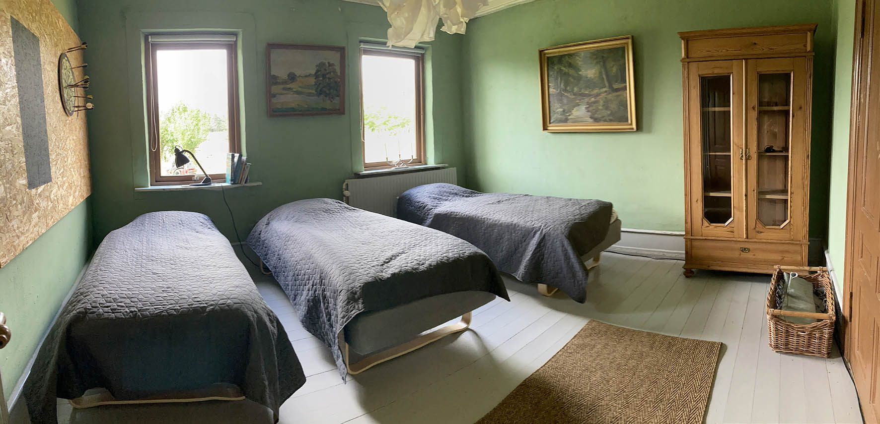 Jeg har dette her hus til leje. Der er 10 sovepladser – 4 soveværelser. Den ligger i Klemsker ude i naturen uden naboer, oliefyr, 2 stk. luft til luft varme, brændeovn, bålplads, hængekøjer og mulighed for at slå telt op. Og i er velkomne til at komme før og blive længere, I skal selv have senge linned og håndklæder med.