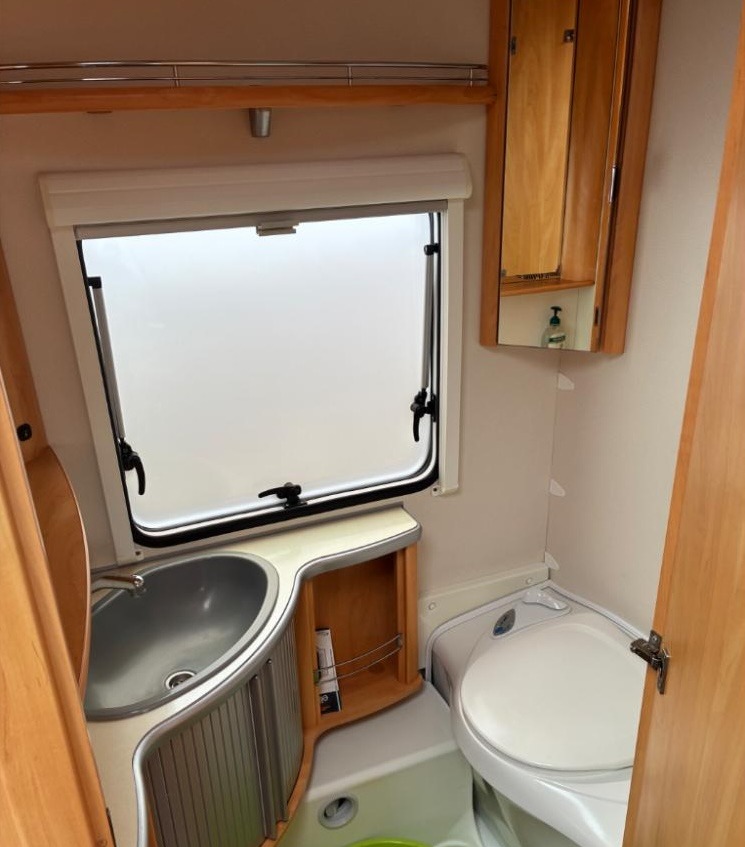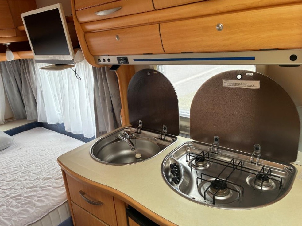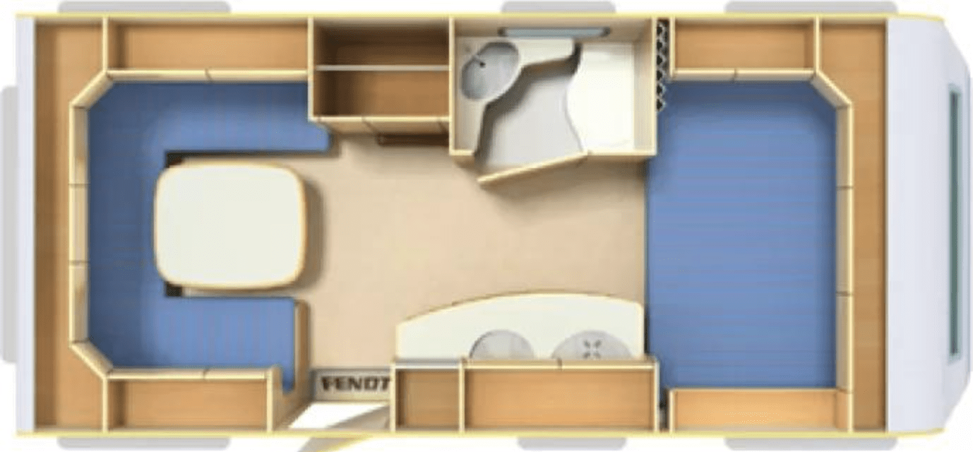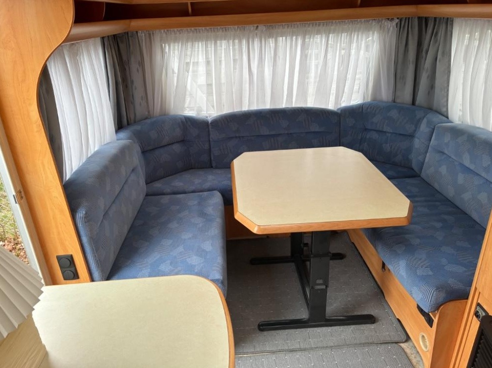 Stor campingvogn med fortelt i v. Vestermarie Plantage Der er køkken og toilet – dog er der ikke varmt vand i vognen.